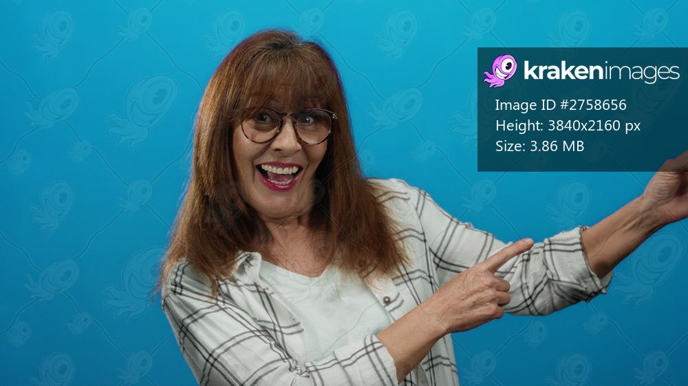 Senior hispanic woman in glasses, smiling and pointing joyfully against an isolated blue background wall, wearing a white plaid shirt.