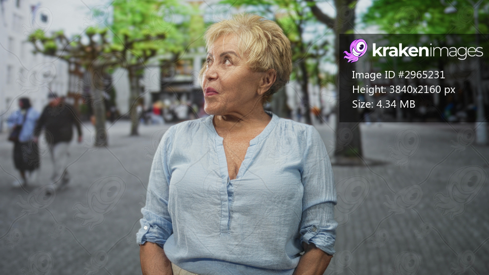 Senior hispanic woman in light blue blouse looks right with hands in pockets, slight smile and turned head, standing among trees and shoppers on a busy street; quiet contentment. - Kraken Images