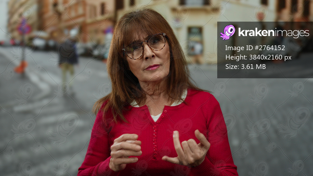 Senior hispanic woman in red sweater gestures expressively on a busy city street, illustrating the vibrant urban outdoor life.