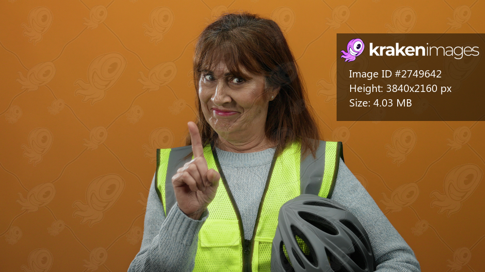 Senior hispanic woman in safety vest points to herself with a bicycle helmet and gestures no against orange background