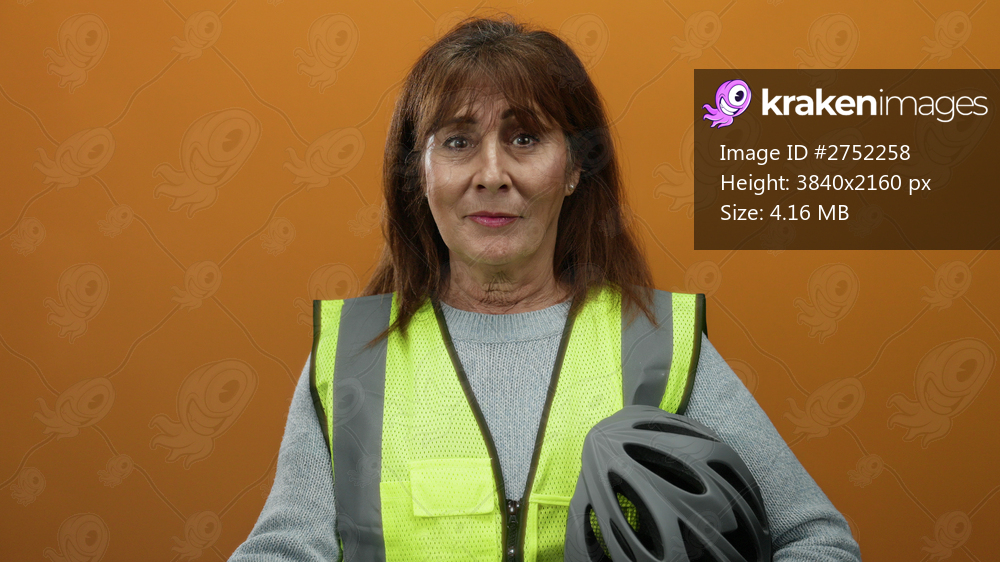 Senior hispanic woman in safety vest points to herself with a bicycle helmet and gestures no against orange background