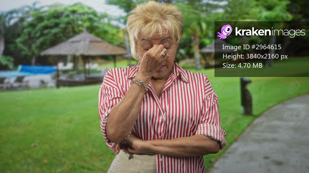 Senior hispanic woman pinching nose with hand outside by resort building and pool gazebo; fatigue concern.