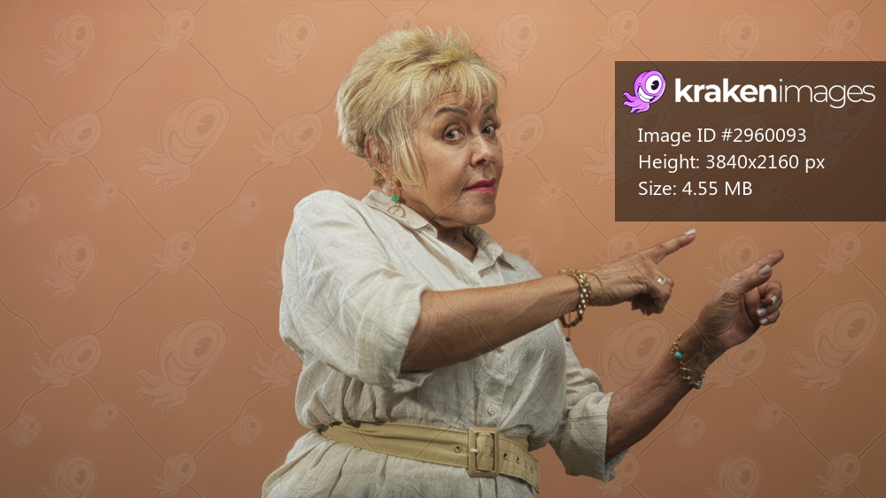 Senior hispanic woman pointing with both index fingers, hands visible, wearing white linen shirt and beige belt against a studio backdrop; confidence assertiveness. - Kraken Images