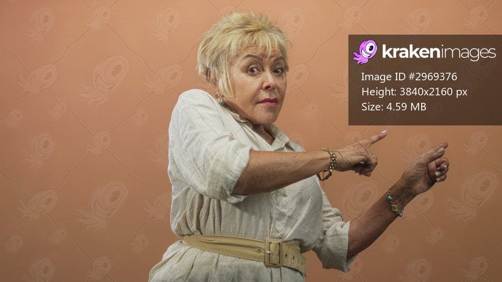 Senior hispanic woman pointing with both index fingers, hands visible, wearing white linen shirt and beige belt against a studio backdrop; confidence assertiveness. - Kraken Images