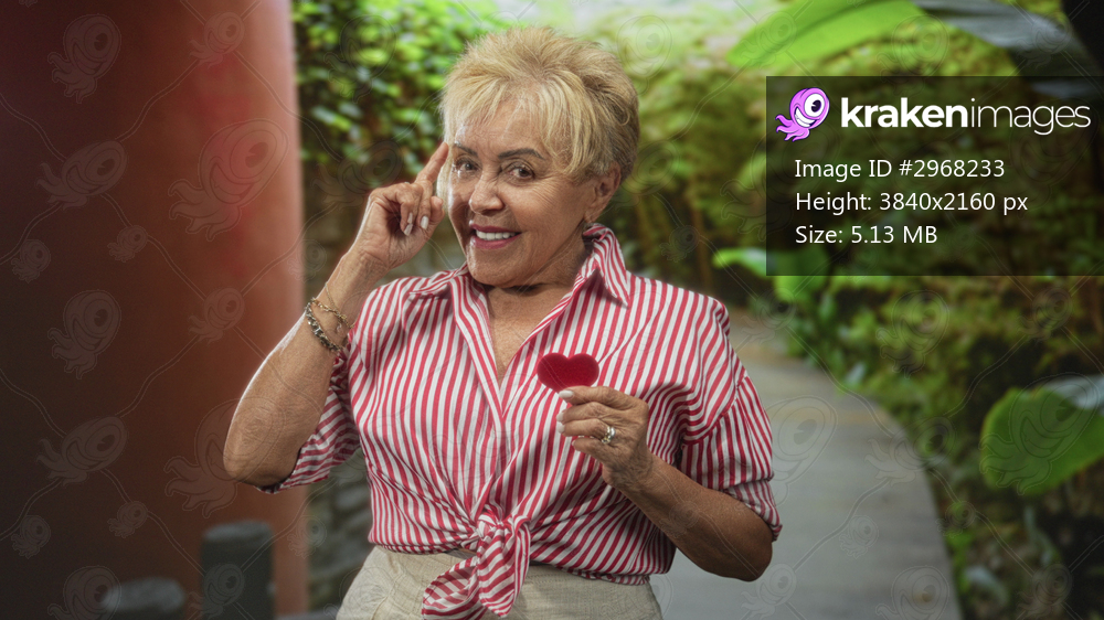Senior hispanic woman points finger and holds a small red heart on a building walkway among greenery; affection invitation.