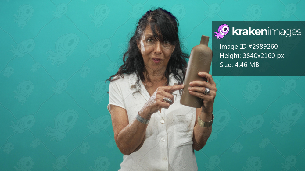 Senior hispanic woman points finger to pottery bottle held at chest height in studio while wearing rings and bracelet; curiosity product demonstration. - Kraken Images