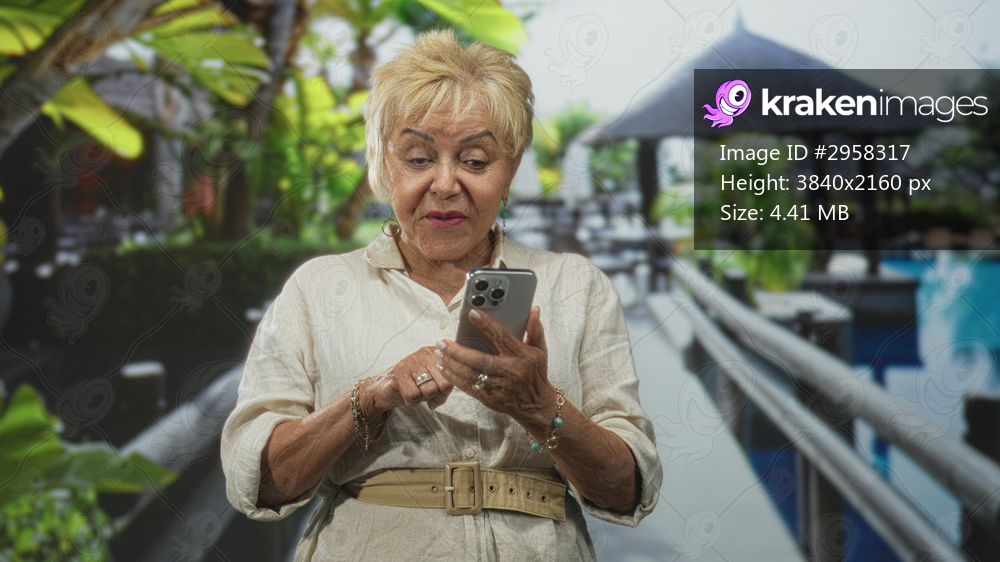 Senior hispanic woman points finger to smartphone while holding phone and smiling in a studio with tropical resort backdrop and pool walkway; connection technology joy. - Kraken Images