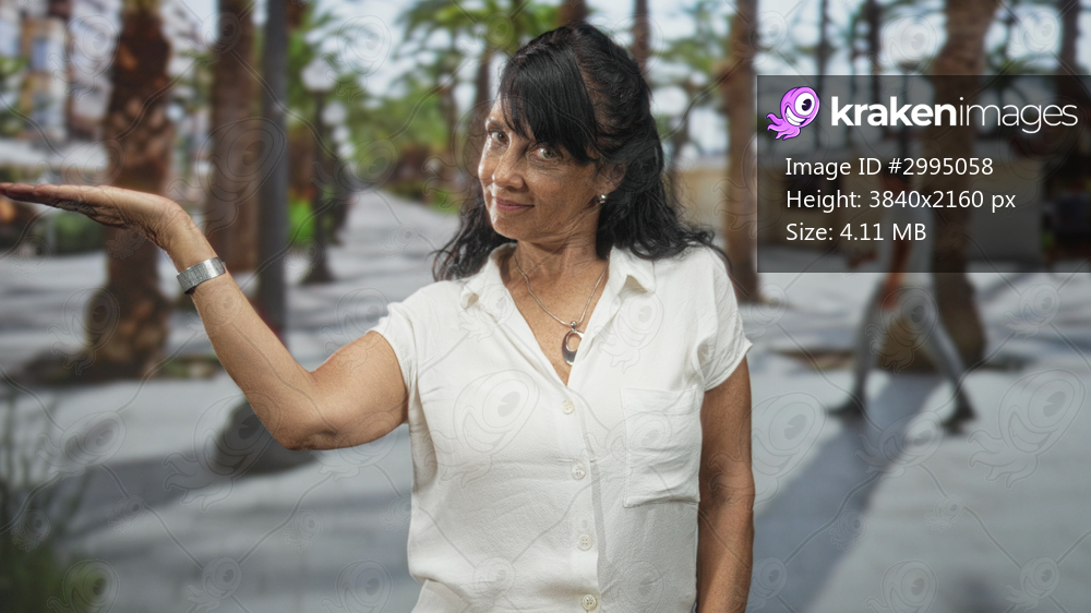 Senior hispanic woman presenting with outstretched hand on street wearing white shirt and necklace; contentment.