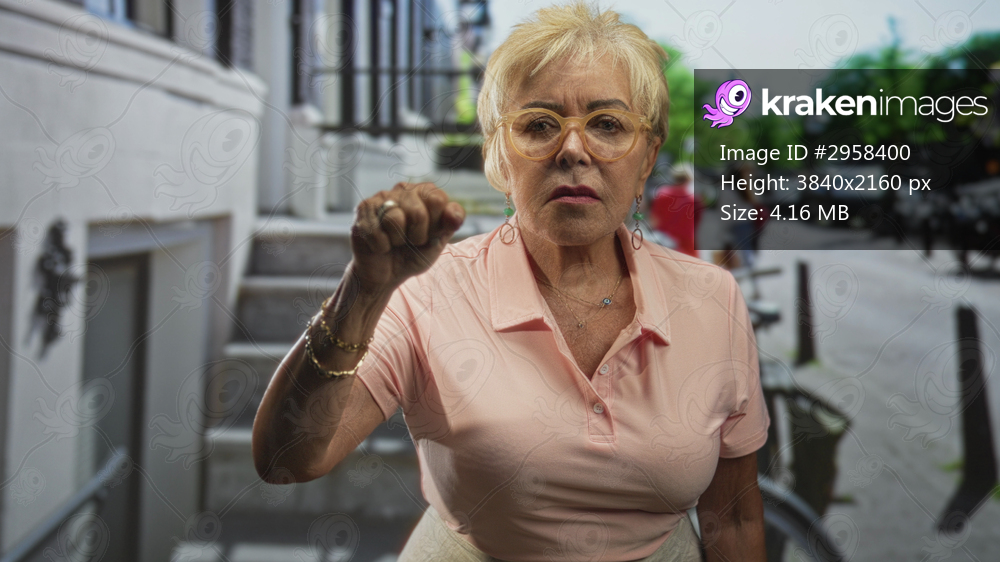 Senior hispanic woman raising clenched fist on street steps near building entrance; defiance determination.