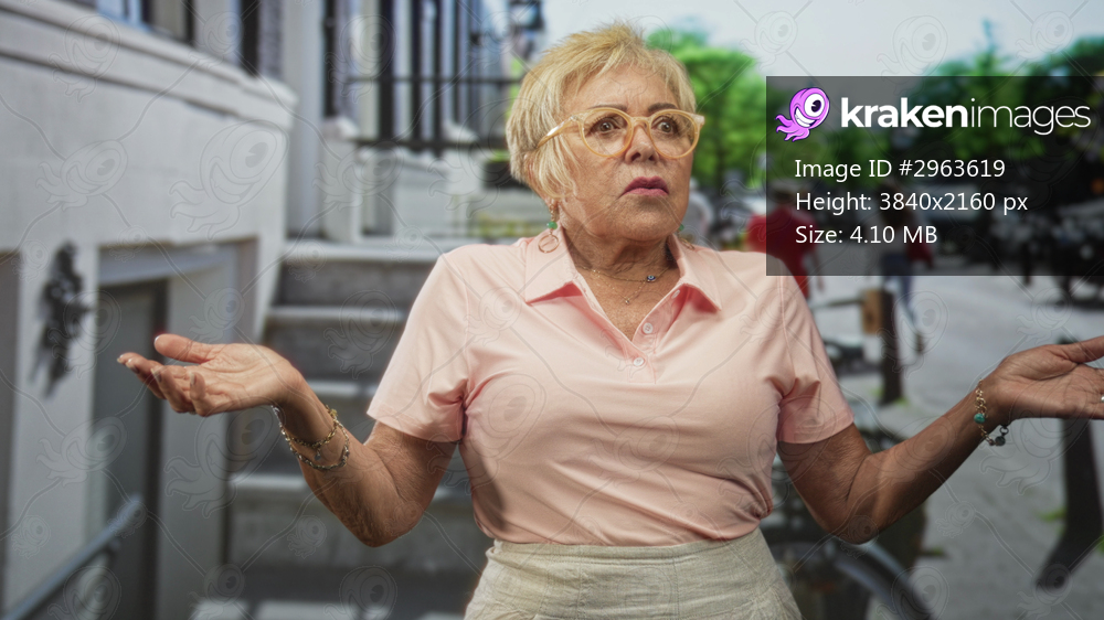 Senior hispanic woman raising clenched fist on street steps near building entrance; defiance determination.