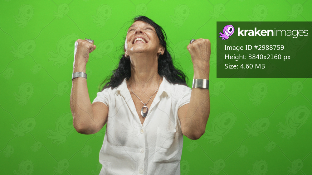 Senior hispanic woman raising clenched fists and flexing arms in studio green screen with white shirt and silver bracelets; joy empowerment.