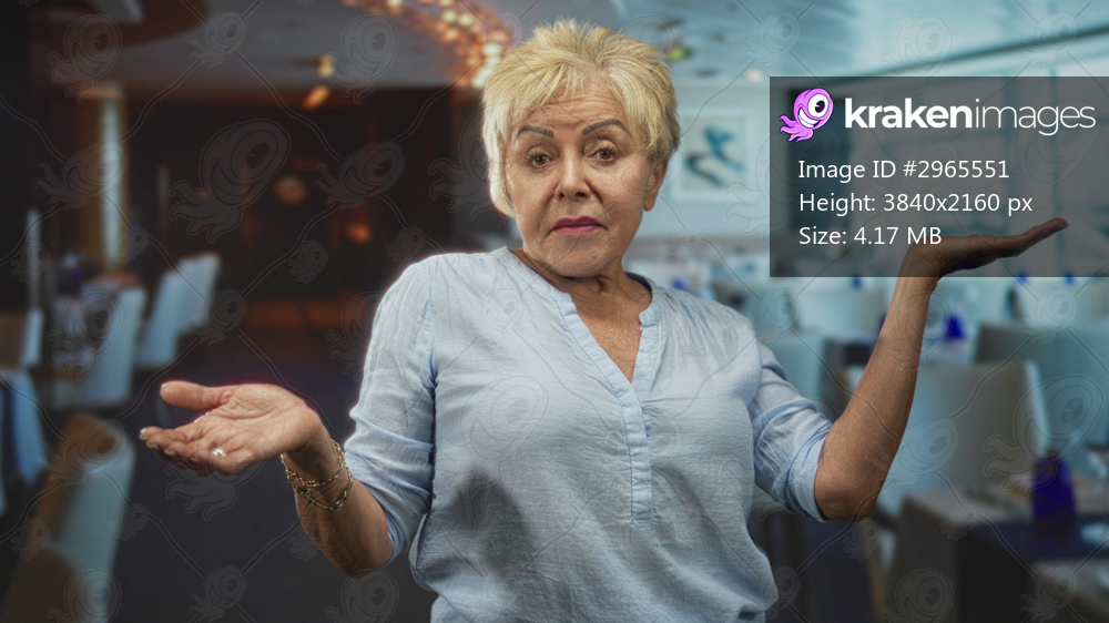 Senior hispanic woman shrugging with open palms and raised eyebrows in a restaurant dining room inside a building; uncertainty.