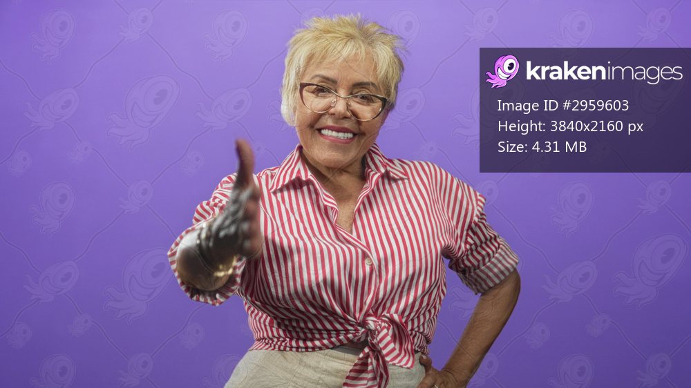 Senior hispanic woman smiles and extends a gloved hand for handshake in a purple studio; welcoming connection.