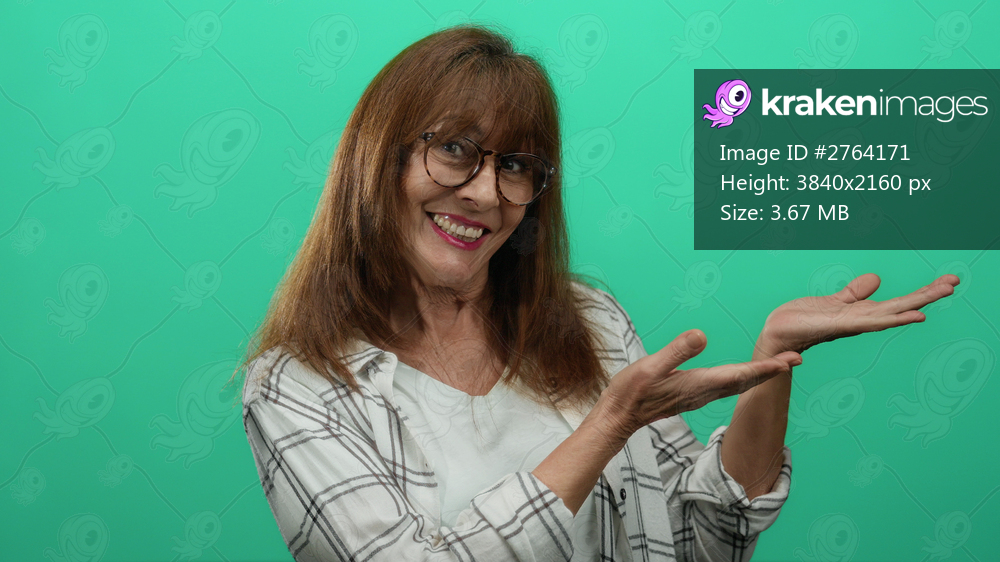 Senior hispanic woman smiling with a thumbs-up gesture against a vibrant green wall, wearing glasses and casual attire, conveying positivity and friendliness. - Kraken Images