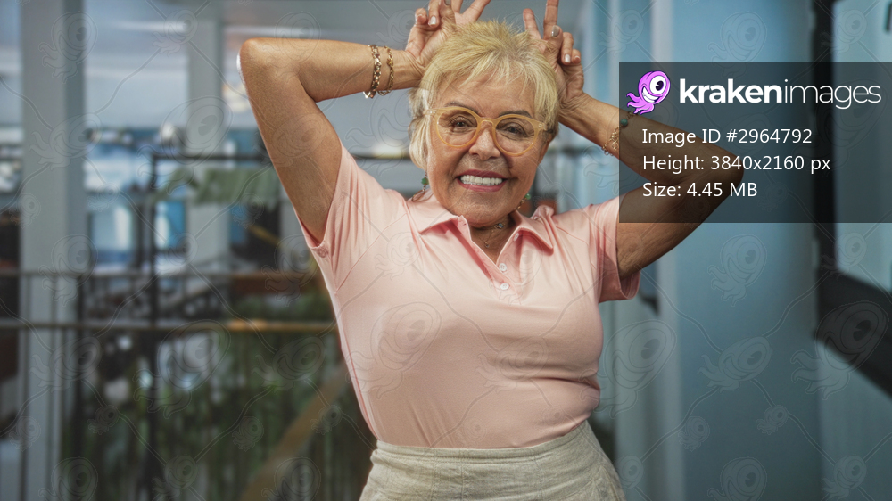Senior hispanic woman smiling with hands behind head, wearing pink polo and glasses in a modern building; joyful confidence.