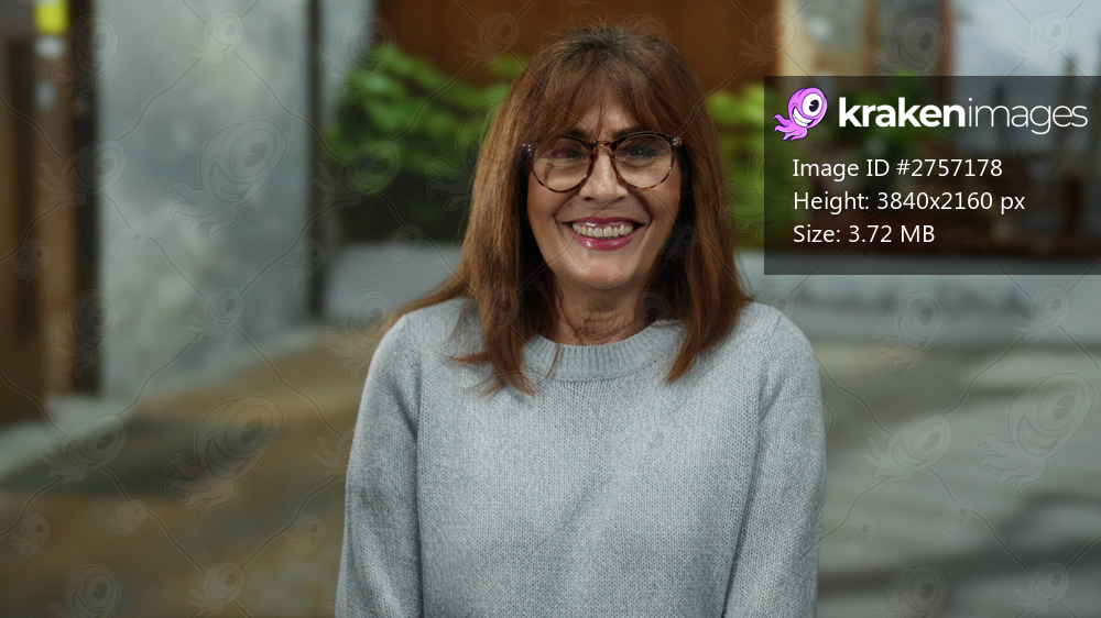 Senior hispanic woman smiling joyfully outdoors on a sunny city street surrounded by greenery and modern buildings reflecting urban lifestyle and vibrancy - Kraken Images