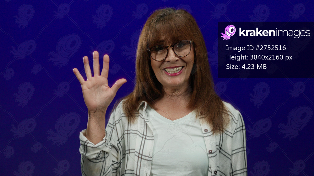 Senior hispanic woman smiling and waving with five fingers against a blue background, wearing glasses and a checkered shirt, indicating friendly interaction or greeting. - Kraken Images