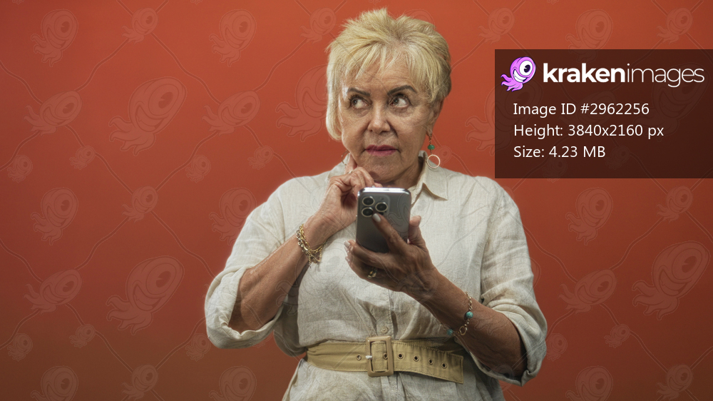 Senior hispanic woman taps smartphone screen with hands while standing in studio; digital independence focus.