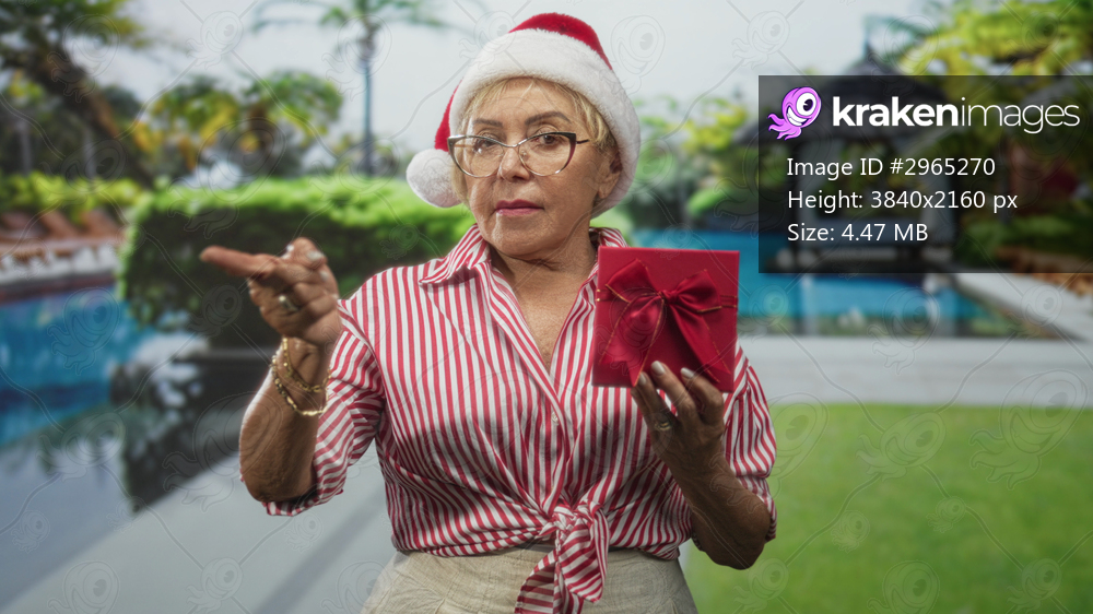 Senior hispanic woman wearing a santa hat smiles while holding a wrapped gift in a studio; joyful warmth.