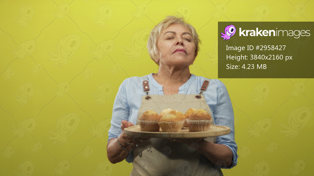Senior hispanic woman wearing apron holding muffins on a tray, eyes closed smelling them in studio; homemade baking comfort.