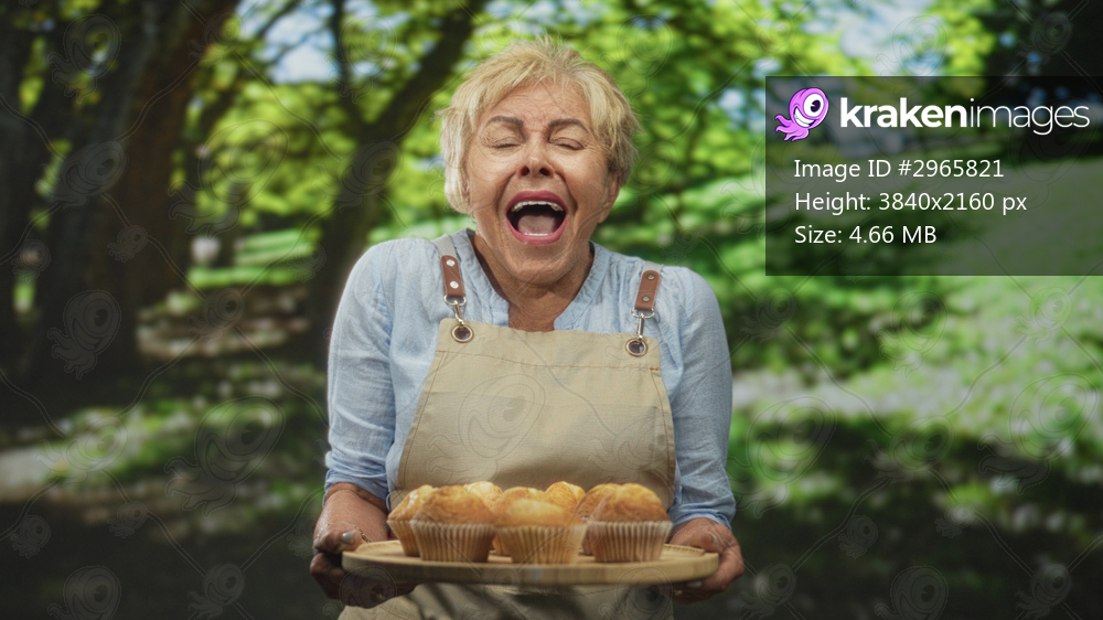 Senior hispanic woman wearing apron holding tray of muffins with mouth open mid sneeze in forest; surprise.