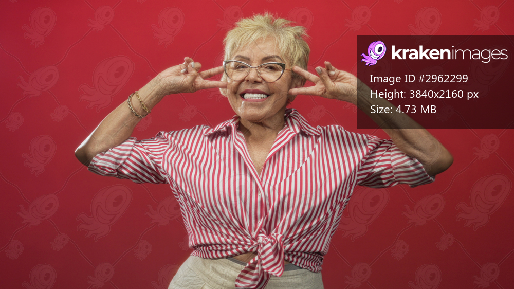 Senior hispanic woman wearing eyeglasses and a tied red striped shirt frames her eyes with peace sign fingers while smiling broadly against a red studio backdrop; playful joy. - Kraken Images