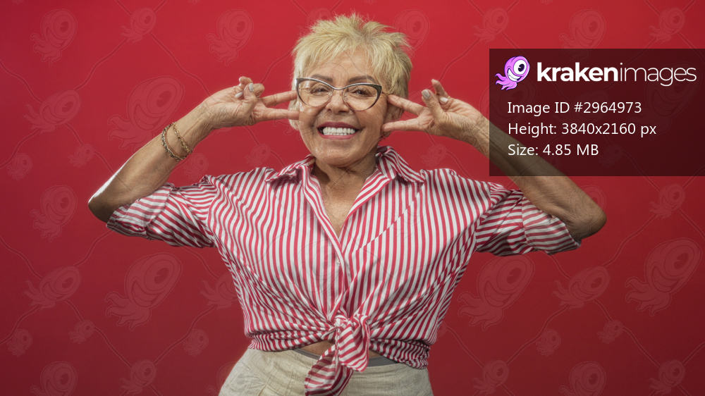 Senior hispanic woman wearing eyeglasses and a tied red striped shirt frames her eyes with peace sign fingers while smiling broadly against a red studio backdrop; playful joy. - Kraken Images
