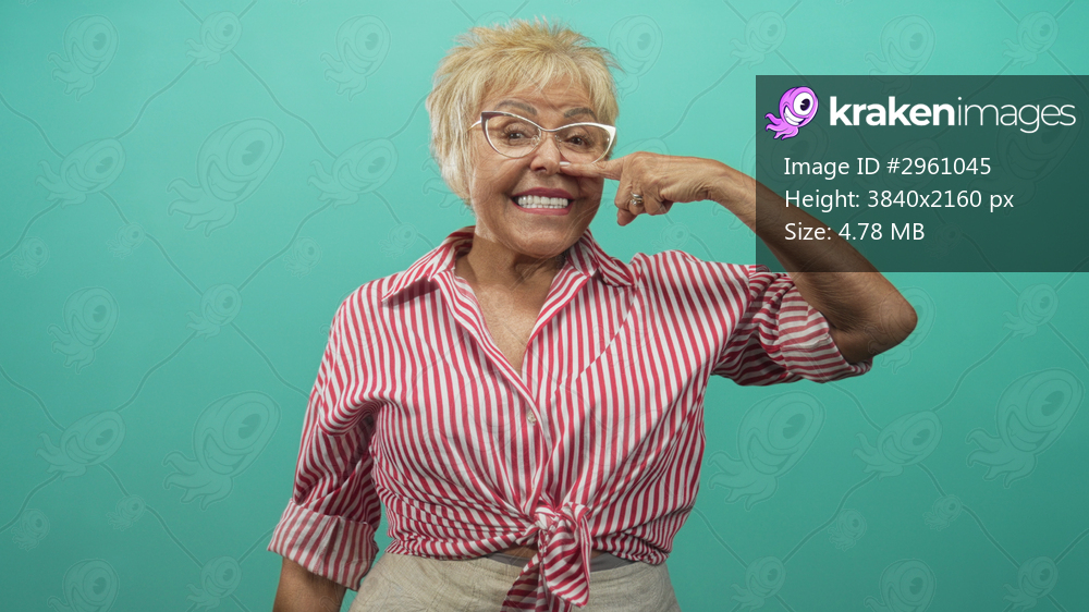 Senior hispanic woman wearing glasses and a tied red striped shirt points index finger to her nose while smiling against a turquoise backdrop in studio; playful confidence. - Kraken Images