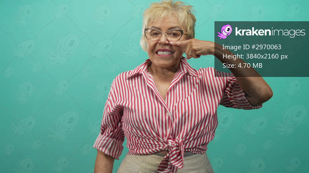 Senior hispanic woman wearing glasses and a tied red striped shirt points index finger to her nose while smiling against a turquoise backdrop in studio; playful confidence. - Kraken Images