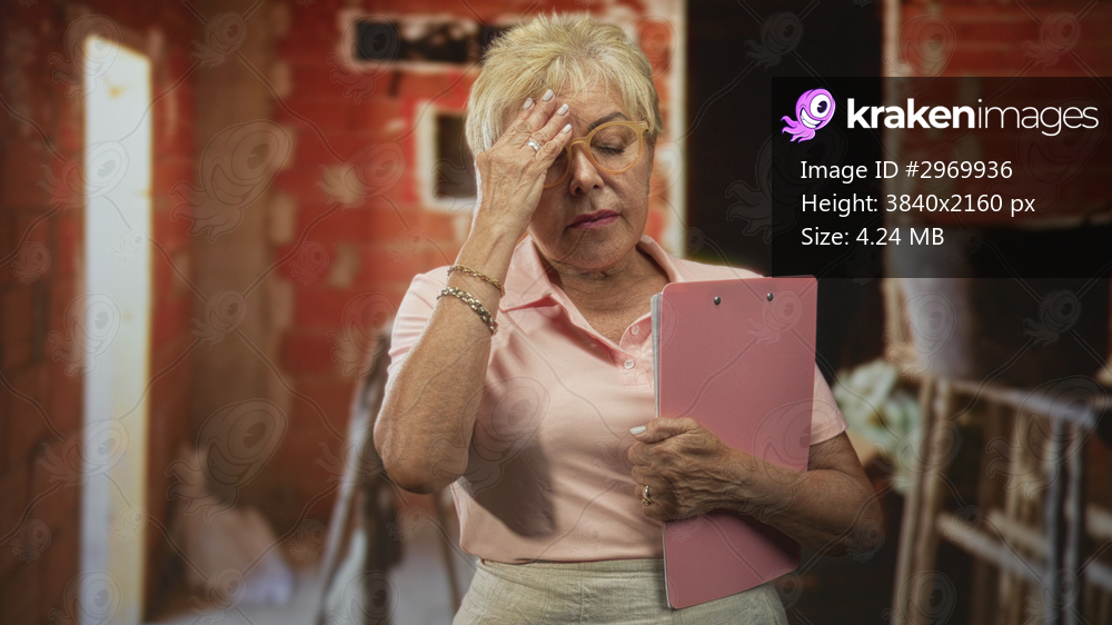 Senior hispanic woman wearing glasses holding pink clipboard with hand on forehead in building under renovation; stress resilience.