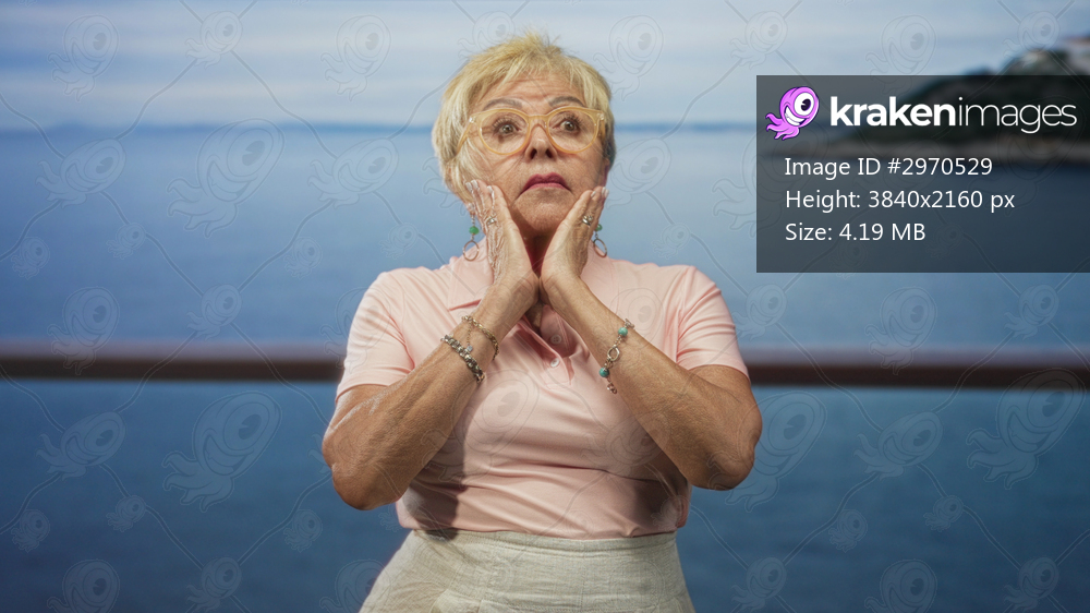 Senior hispanic woman wearing glasses presses her cheeks with both hands in a surprised gesture on a studio seascape set; surprise.