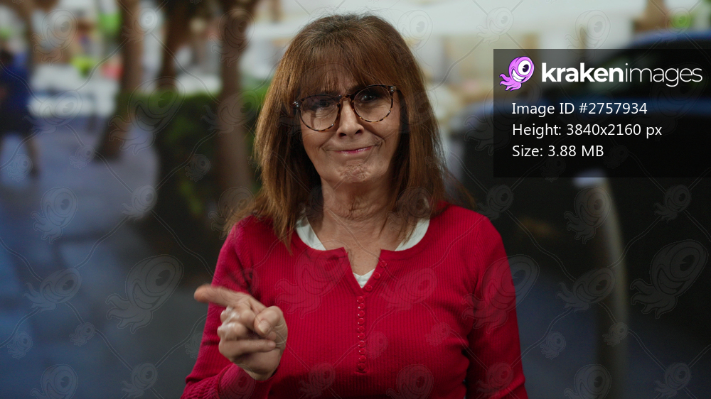 Senior hispanic woman wearing glasses and red shirt gestures on a bustling city street with blurred background suggesting urban outdoor scene