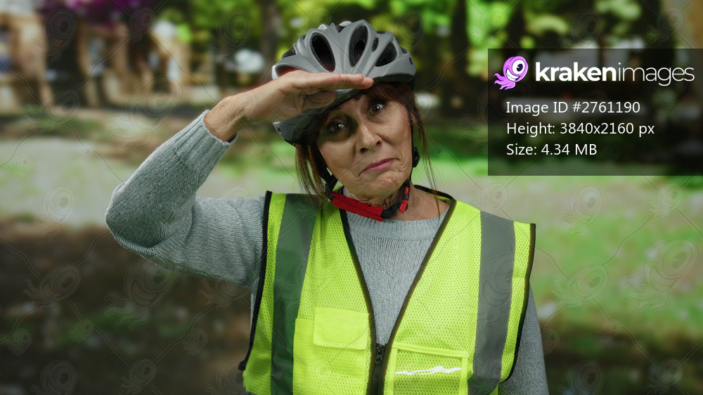 Senior hispanic woman wearing helmet and reflective vest looks into distance in park setting with trees and greenery surrounding her, embodying outdoor safety and elder activity. - Kraken Images