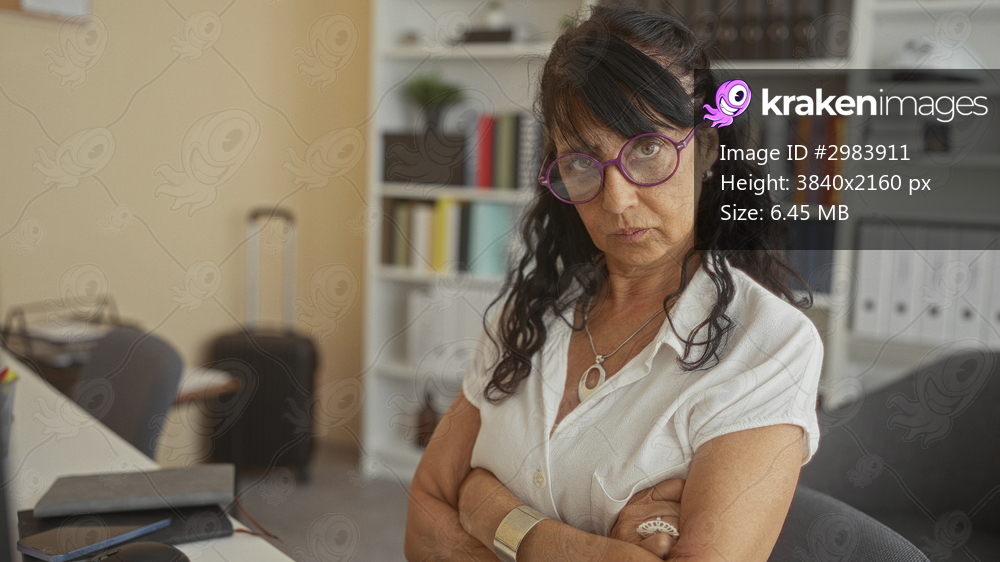 Senior hispanic woman wearing purple glasses and necklace touches nose, folds arms and sits at desk in office building; skepticism contemplation quiet resolve.
