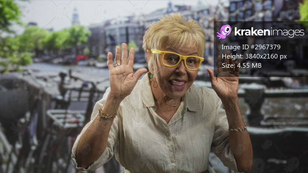 Senior hispanic woman wearing yellow glasses and bracelets raises both hands, smiles and sticks out tongue in front of a studio canal backdrop; playful confidence. - Kraken Images