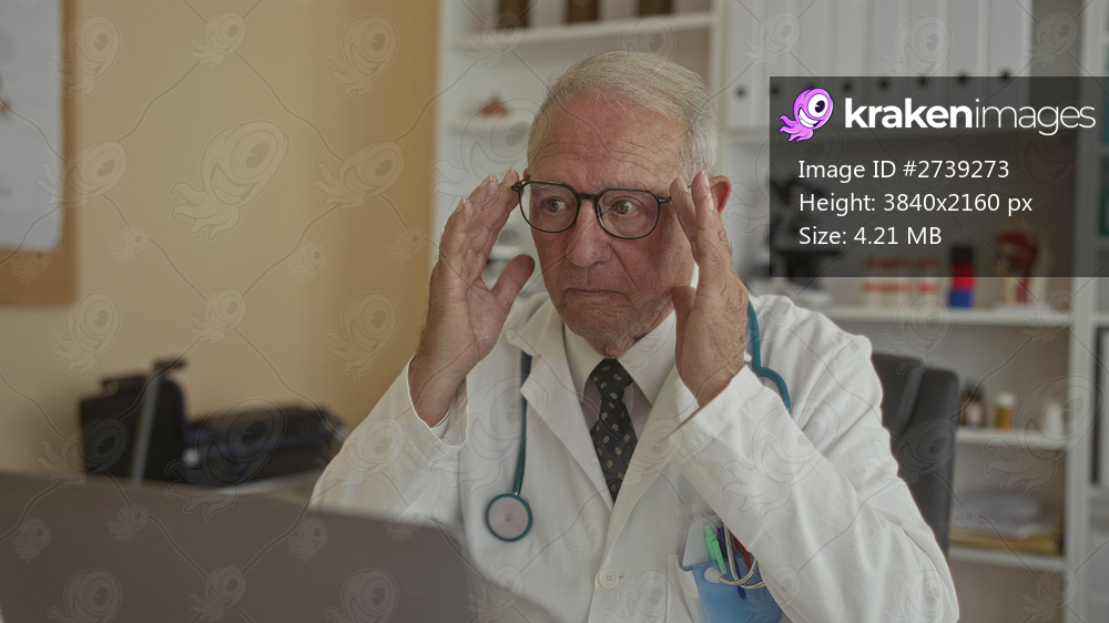 Senior male doctor in uniform at desk in hospital clinic examining computer screen with serious expression as medical equipment surrounds him.