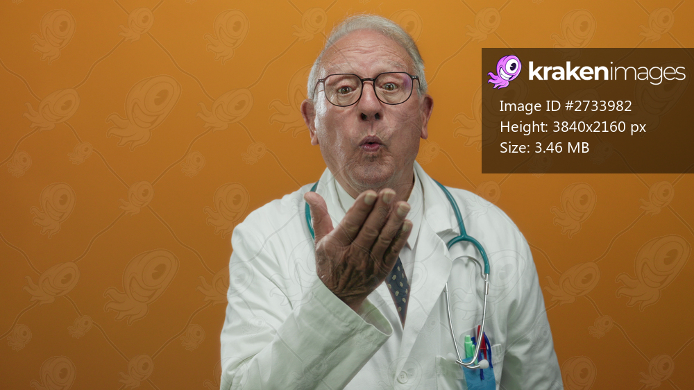 Senior male doctor in uniform blows kiss against vibrant orange background expressing care and compassion isolated in professional setting.