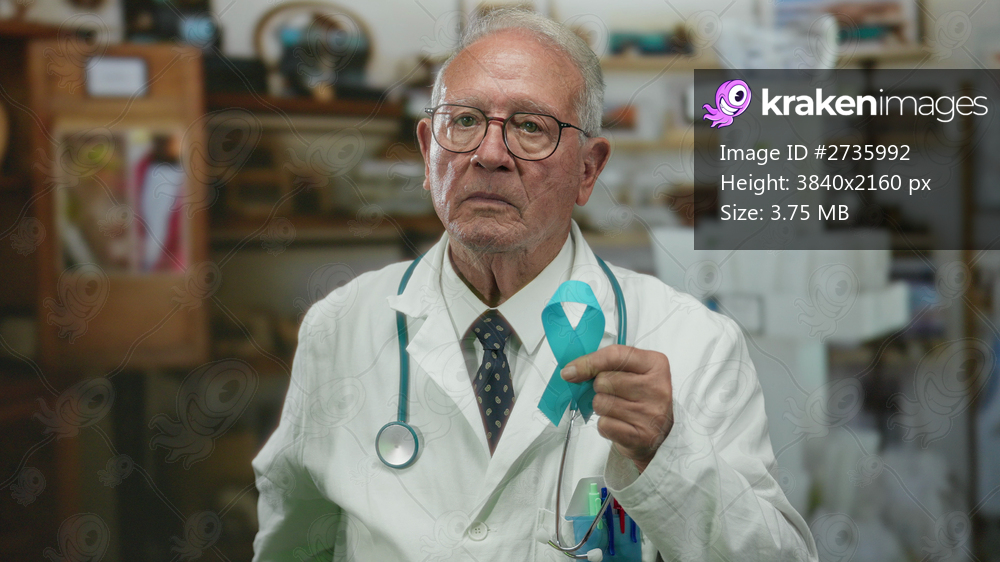Senior male doctor indoors holding a blue ribbon with a focused expression, wearing a stethoscope and white coat in a well-lit room indicating medical awareness campaign. - Kraken Images