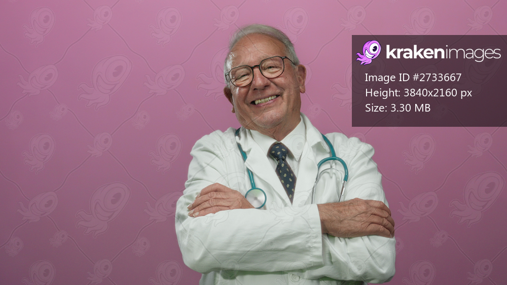 Senior male doctor stands confidently with arms crossed, smiling against an isolated pink background, wearing a medical uniform and glasses, conveying professionalism and approachability. - Kraken Images