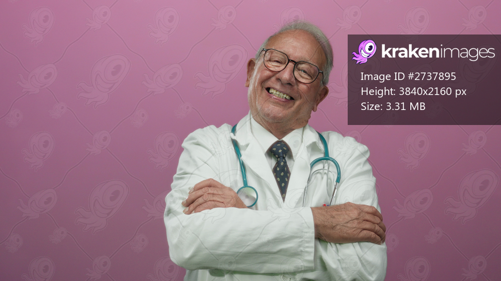 Senior male doctor stands confidently with arms crossed, smiling against an isolated pink background, wearing a medical uniform and glasses, conveying professionalism and approachability. - Kraken Images