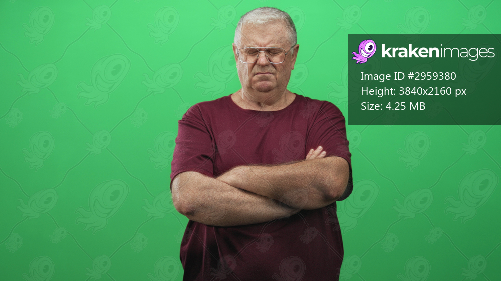 Senior man arms crossed wearing glasses and maroon shirt in studio green screen; disapproval stubbornness.