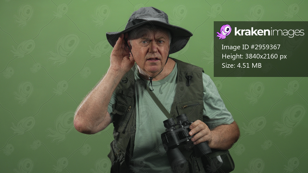 Senior man with binoculars cupping ear and listening, wearing fishing hat and field vest in studio; curiosity exploration.