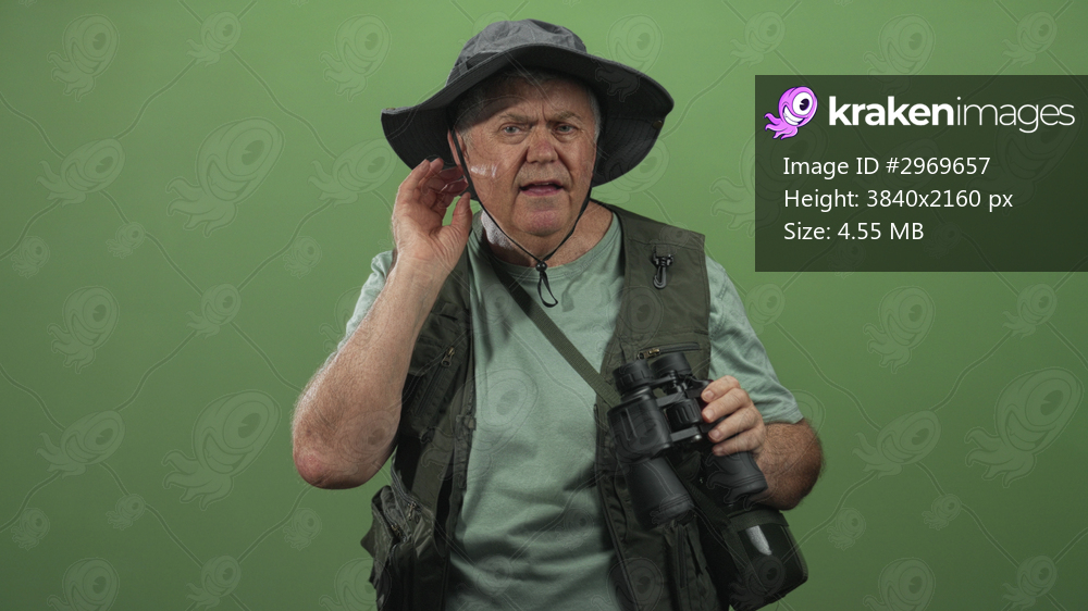 Senior man with binoculars cupping ear and listening, wearing fishing hat and field vest in studio; curiosity exploration.