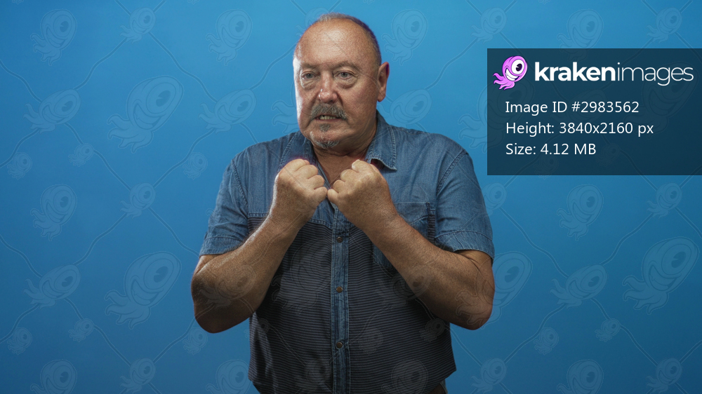 Senior man clutching denim shirt with clenched fists and closed eyes in studio showing tense hands and forearms; suffering pain.