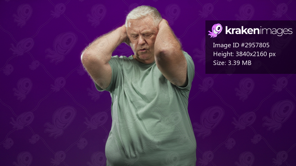 Senior man covering ears with hands in studio grimacing with eyes closed and tense posture, clutching head; pain coping.