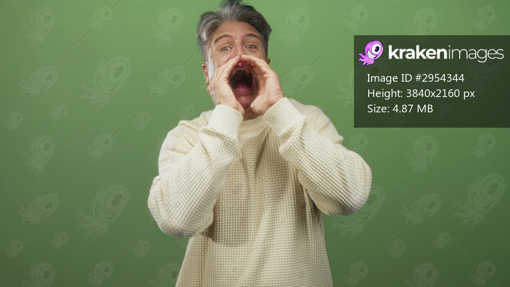 Senior man cupping hands to mouth shouting in studio against green backdrop; urgent alert communication and attention.
