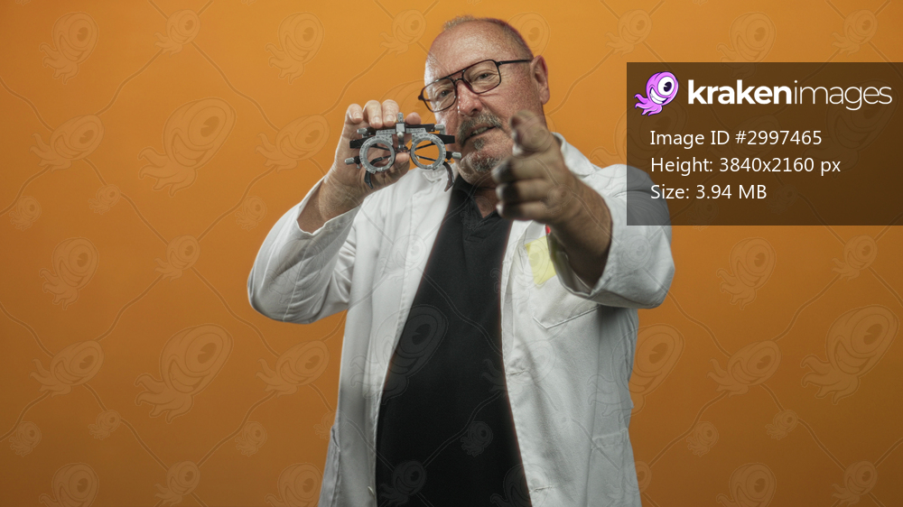 Senior man doctor in white coat holds eye trial frame with one hand and points finger toward camera while wearing glasses in studio; confidence.