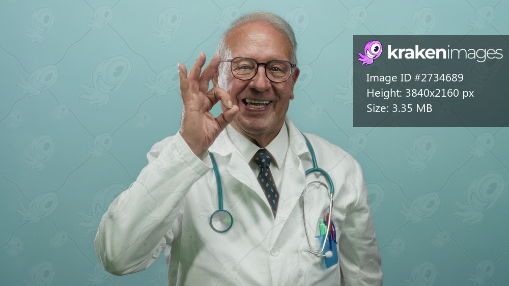Senior man doctor in white uniform making ok gesture smiling confidently over isolated blue background wall showing professionalism and assurance.