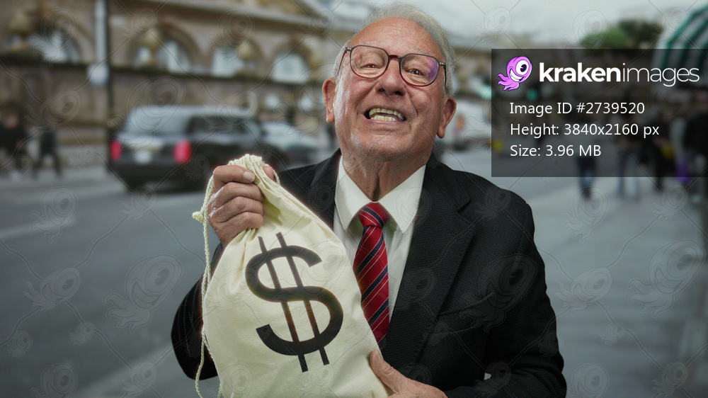 Senior man with dollar bag on bustling street symbolizes business success and corruption themes in urban setting.