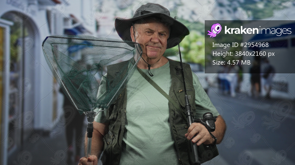 Senior man fisherman smiling holding fishing net and rod on street wearing hat and fishing vest near shops and awning; serenity.